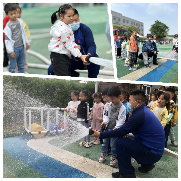 在消防员叔叔的帮助下,孩子们激动地体验了消防水枪,感受到作为小小消防员的神气和勇敢。