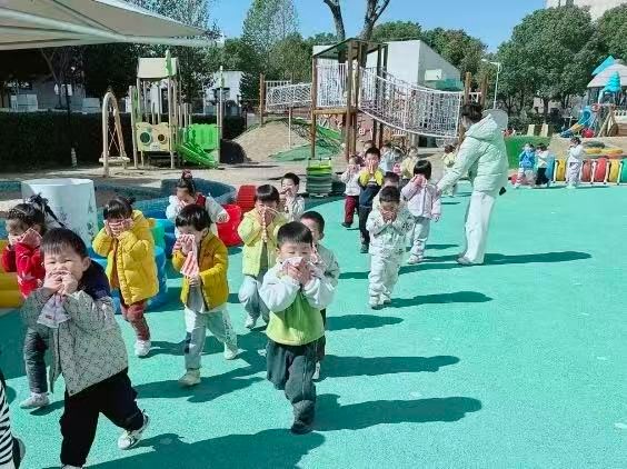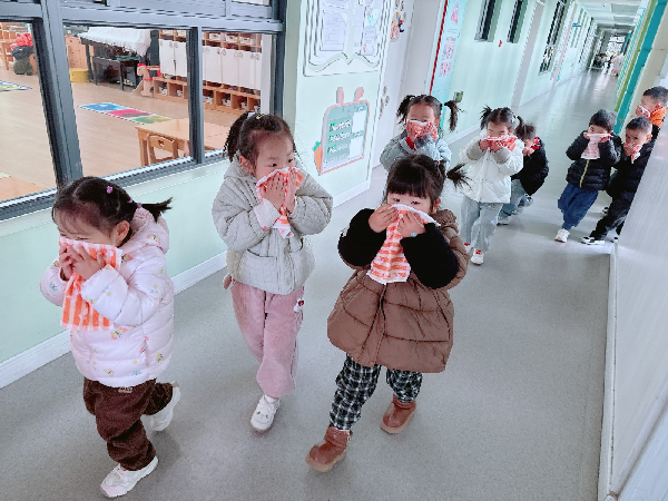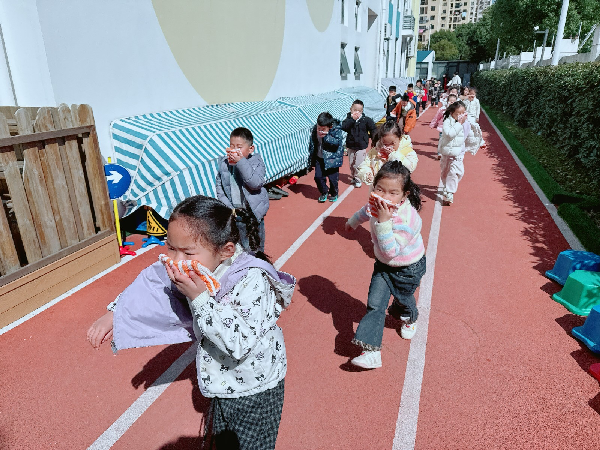 演练警报响起后,各班教师迅速响应,有序组织幼儿用湿毛巾捂住口鼻、弯腰低姿前行,严格按照预定疏散路线,快速、规范、有序地从教室、楼梯撤离至户外安全区域。整个疏散过程紧张有序、忙而不乱,全体师幼仅用时约 2 分钟便完成安全撤离。
